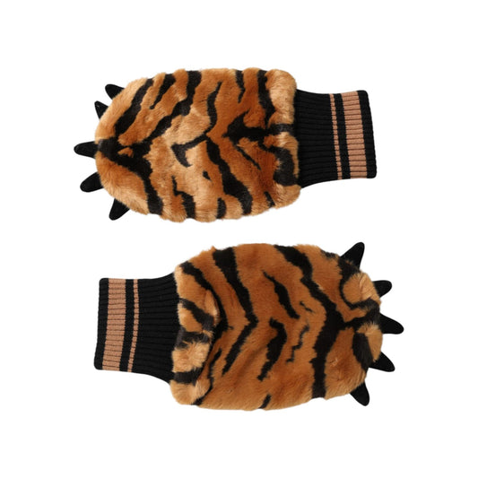 Dolce & Gabbana Brown Tiger Knitted Fur Wrist Mitten One Size Gloves