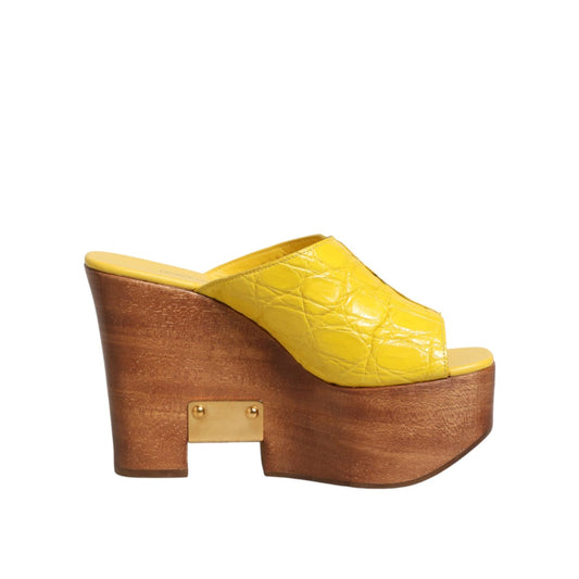 Dolce & Gabbana Yellow Leather Wood Mule Wedge Slides Shoes