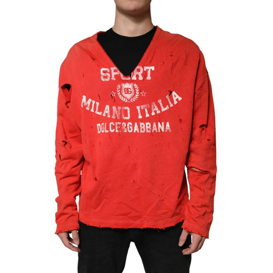 Dolce & Gabbana Red Distressed Cotton V-Neck Sweatshirt Men Sweater