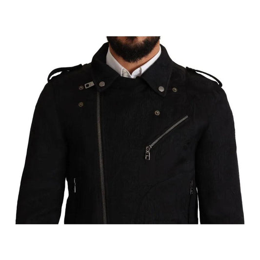 Dolce & Gabbana Black Brocade Full Zip Biker Coat Jacket