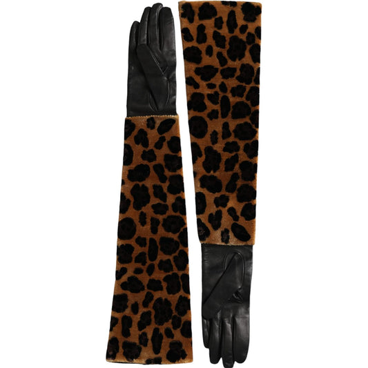 Dolce & Gabbana Brown Black Leopard Leather Elbow Length Gloves