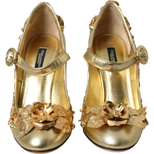 Dolce & Gabbana Gold Leather Crystal Mary Janes Pumps Shoes
